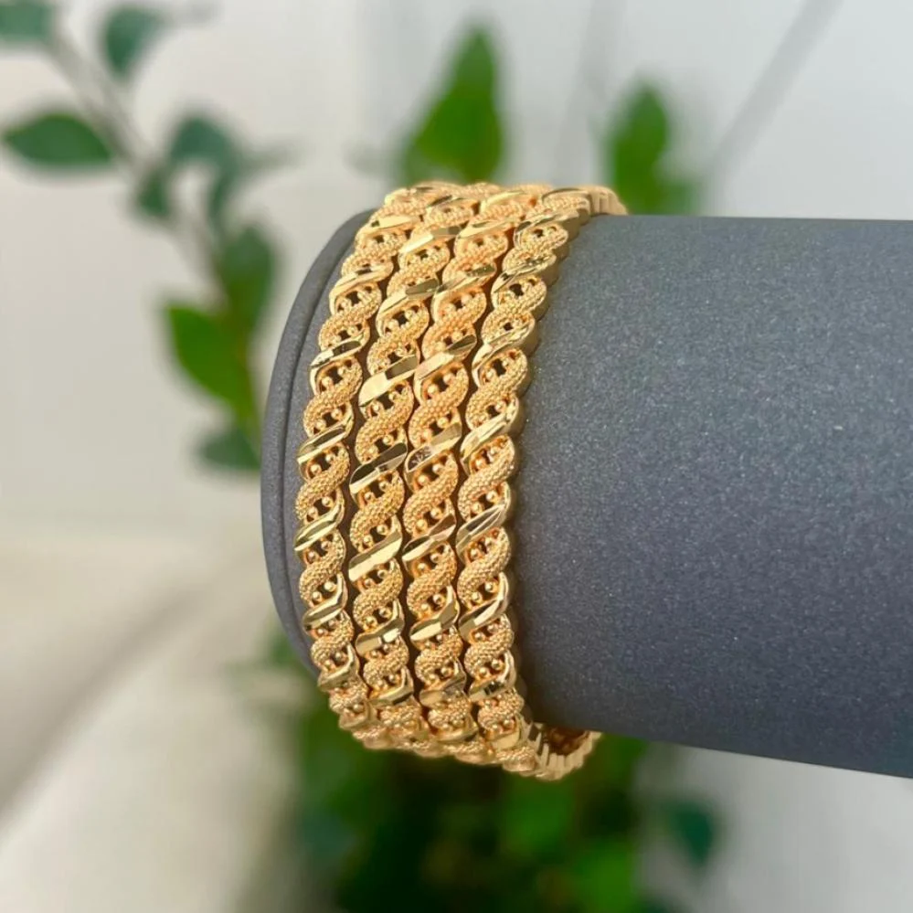These twisted gold-plated bangles add a touch of luxury to your wrist, featuring a simple yet exquisitely elegant design. Their luxurious twisted pattern reflects the brilliance of pure gold, adding a touch of sophistication to any look. These bangles are not just a piece of jewelry; they are a part of your personality, reflecting your refined taste and timeless elegance.