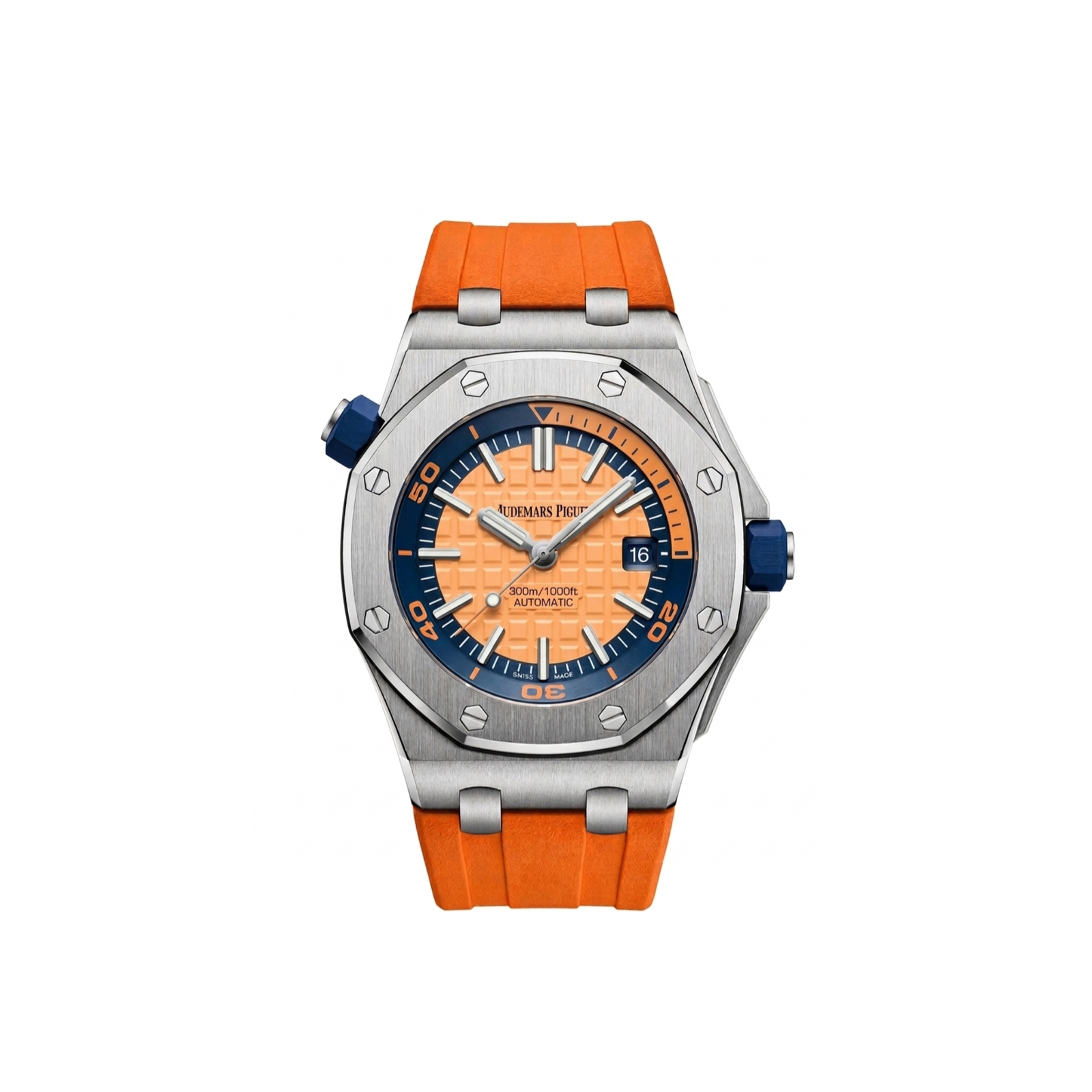The Royal Oak Offshore Diver is an icon of luxury sports watches. This edition stands out with its striking dial featuring the signature “Méga Tapisserie” pattern and high-contrast accents. The brushed stainless steel octagonal bezel, secured by eight hexagonal screws, provides a powerful and recognizable silhouette. The integrated rubber strap ensures a comfortable, secure fit for both active use and daily wear.