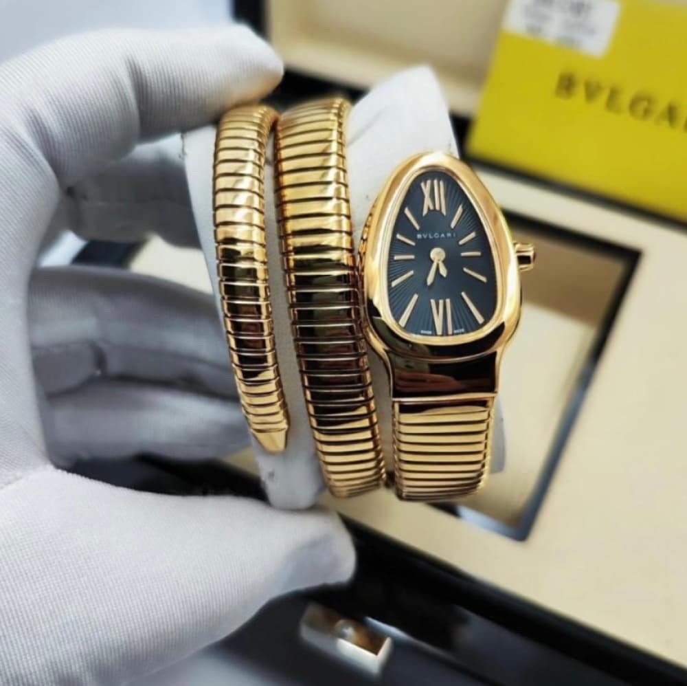 This elegant double-spiral timepiece features the iconic serpent-inspired design, blending sophisticated jewelry with functional watchmaking. The flexible wrap-around bracelet ensures a comfortable, clasp-free fit, while the drop-shaped dial with guilloché detailing provides a refined finish. Crafted to Imitation Quality standards, it is a perfect statement piece for modern elegance.