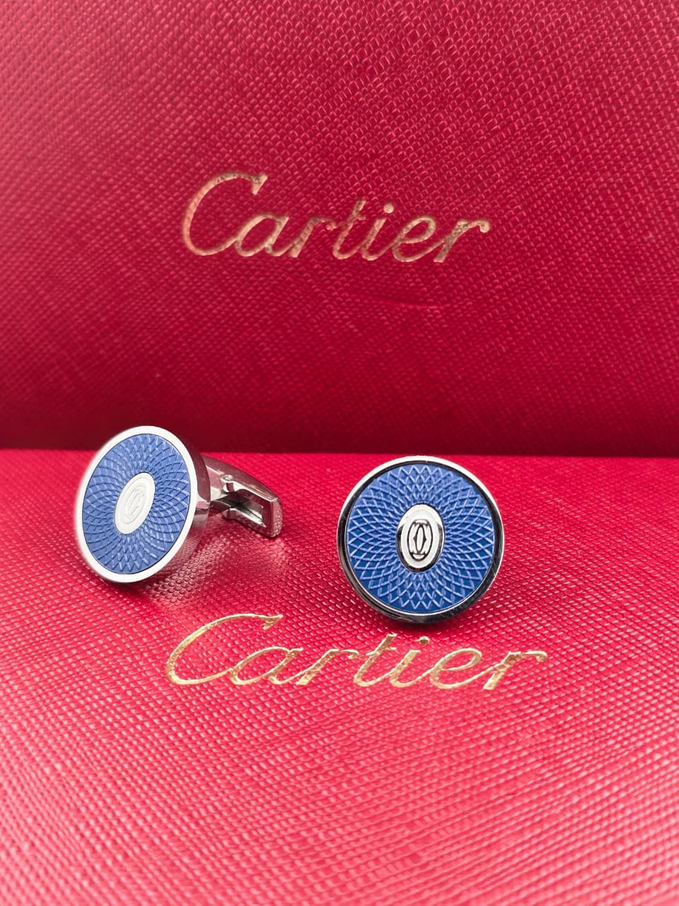 - Premium Cartier cufflinks with blue guilloché dial design