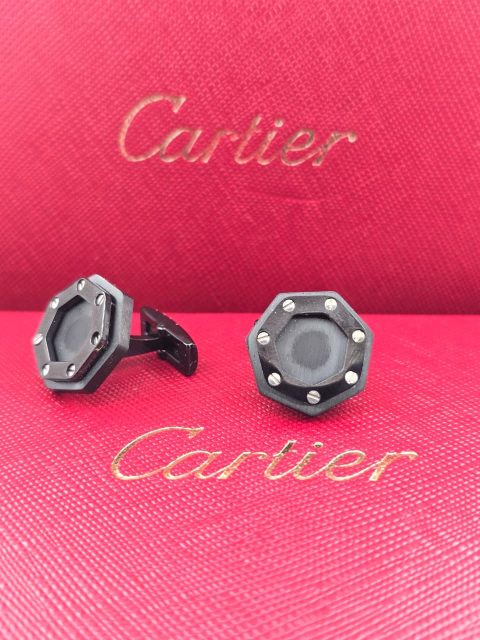 Upgrade your formal style with these striking Cartier cufflinks, designed with a bold matte black hexagonal face and refined metallic stud detailing. The industrial-inspired design brings a contemporary edge, while the clean geometric shape maintains a sophisticated luxury appeal.