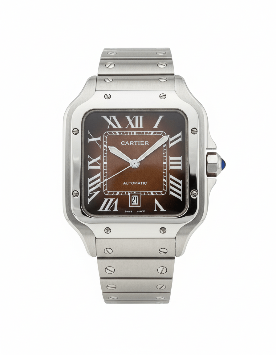 “A classic look for your everyday style. This Cartier Santos features a clean square dial and Roman numerals. Crafted in premium imitation quality to give you a high-end look at a great value.”