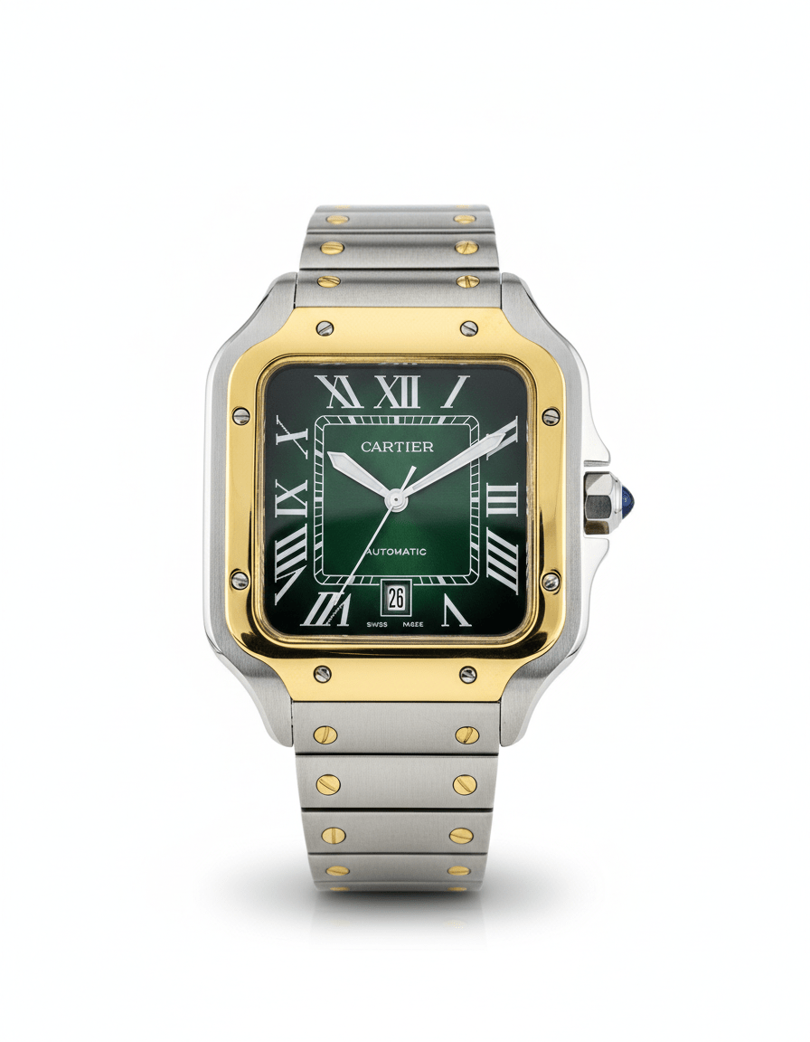 “A classic look for your everyday style. This Cartier Santos features a clean square dial and Roman numerals. Crafted in premium imitation quality to give you a high-end look at a great value.”
