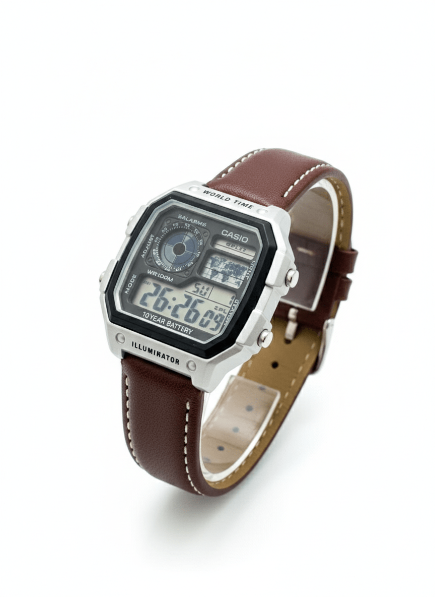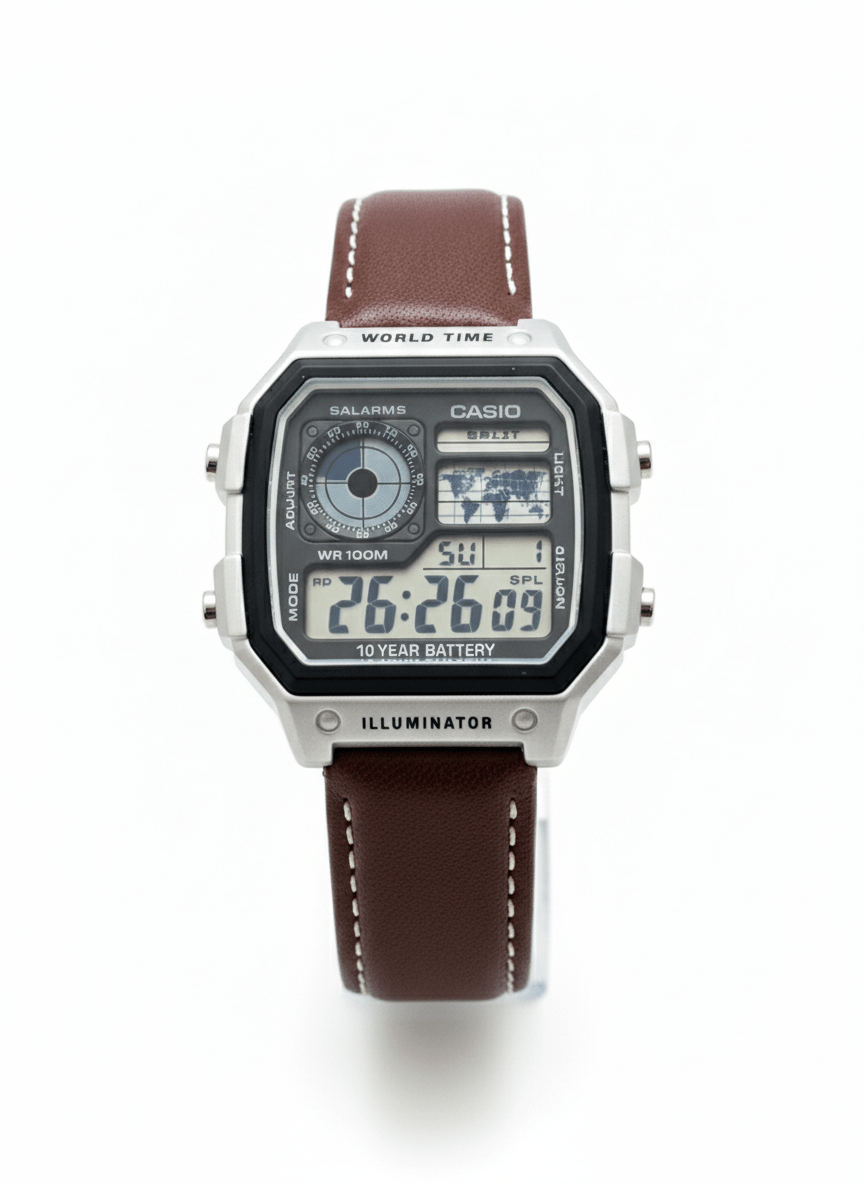 The Casio AE-1200 Royale Silver Edition combines the iconic “World Time” digital heritage with a high-end, custom aesthetic. This model features a sophisticated silver-tone case that perfectly contrasts with the deep dark brown leather strap. The genuine leather strap is finished with precise white stitching, offering a comfortable fit and a classic vintage appearance that looks better with age.