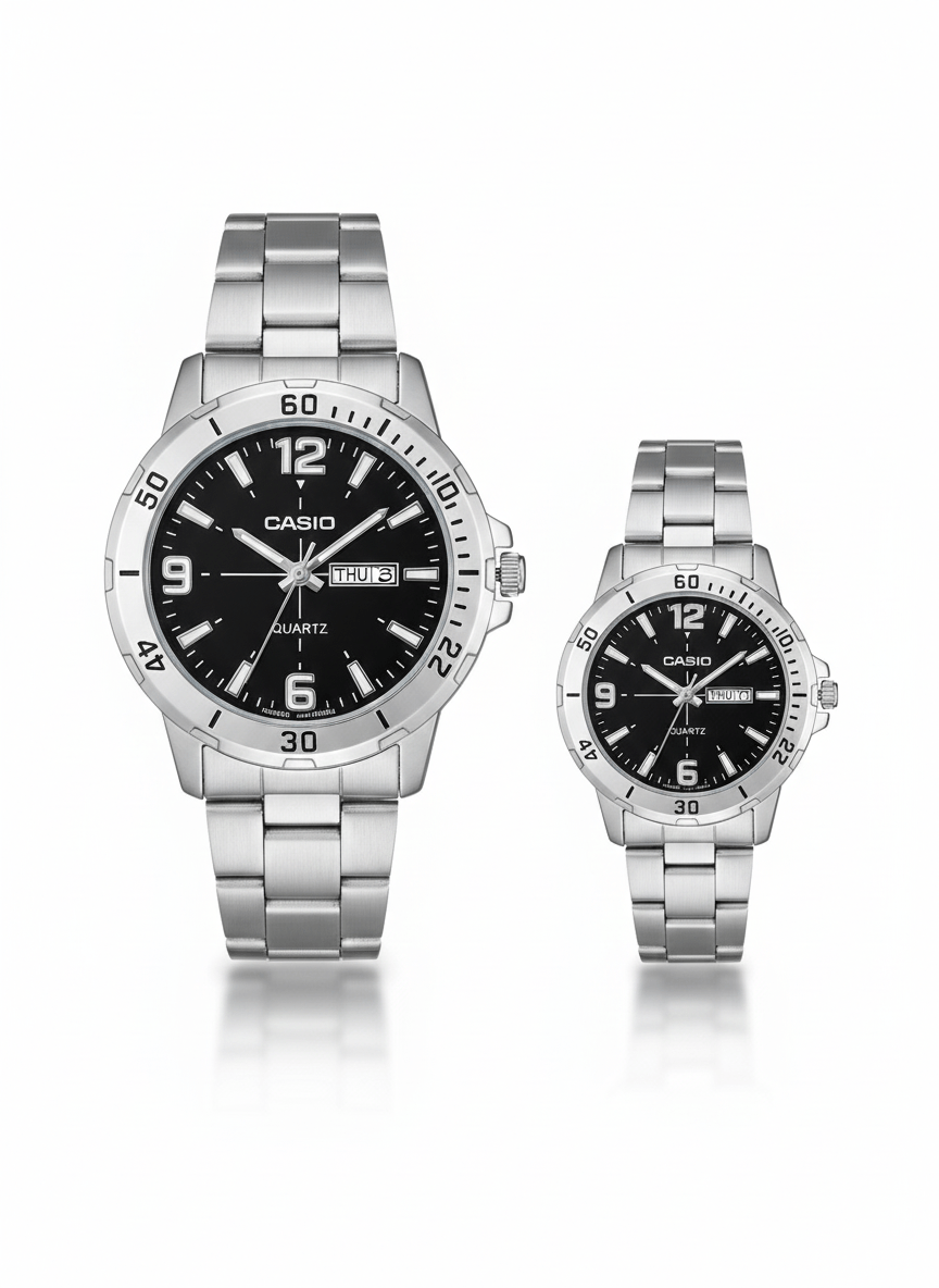 This premium Casio couple watch set is designed for couples who appreciate timeless style and reliable performance. Crafted with a high-quality stainless steel bracelet and a refined dial, this matching set offers a classy and elegant look suitable for daily wear and special occasions.