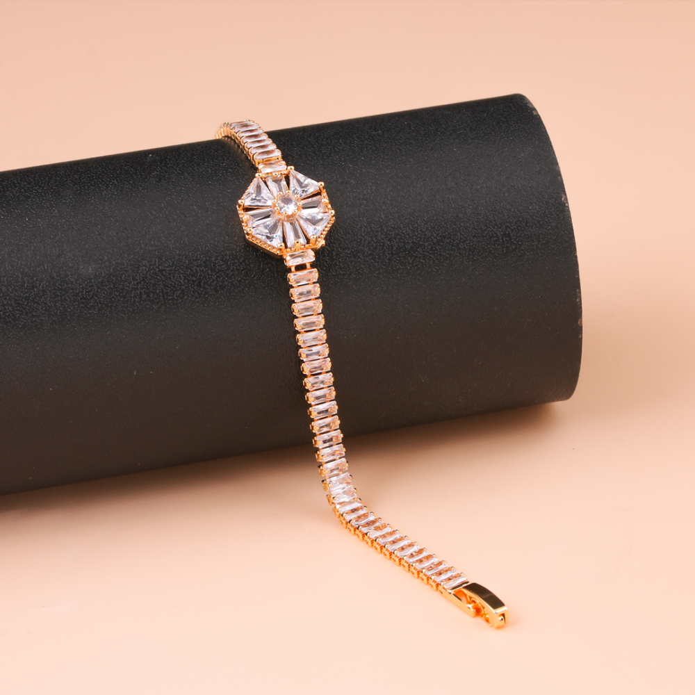 A gold-plated bracelet with a diamond-like sparkle, a luxurious touch that reflects your femininity. Shine with a touch of magic and sophistication with the Diamond Sparkle Gold Alternative Bracelet, designed to combine classic elegance with a luxurious modern design, with delicate details and sparkling stones that add an irresistible shine.