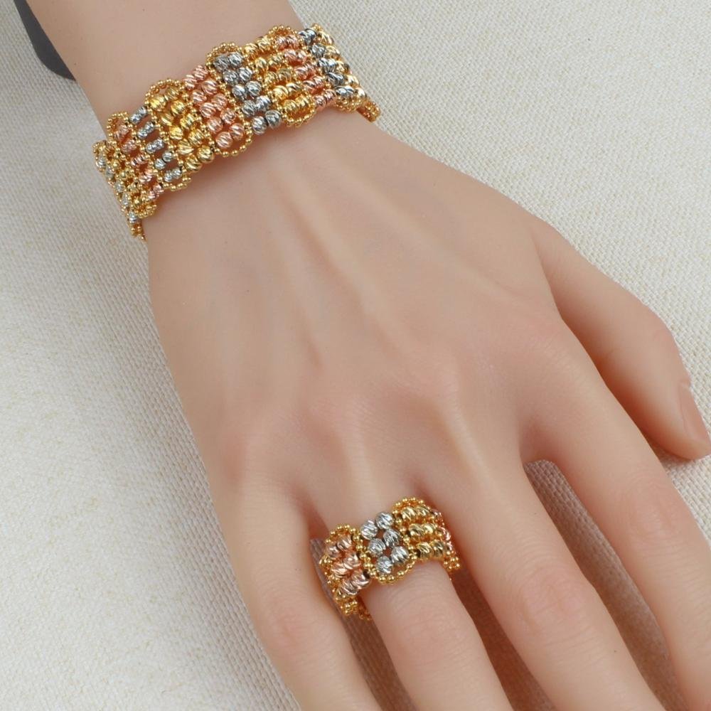 A complete set of bracelets and a ring with a luxurious design that combines three overlapping colors of gold: gold, rose, and silver, to give you a sophisticated and modern look.