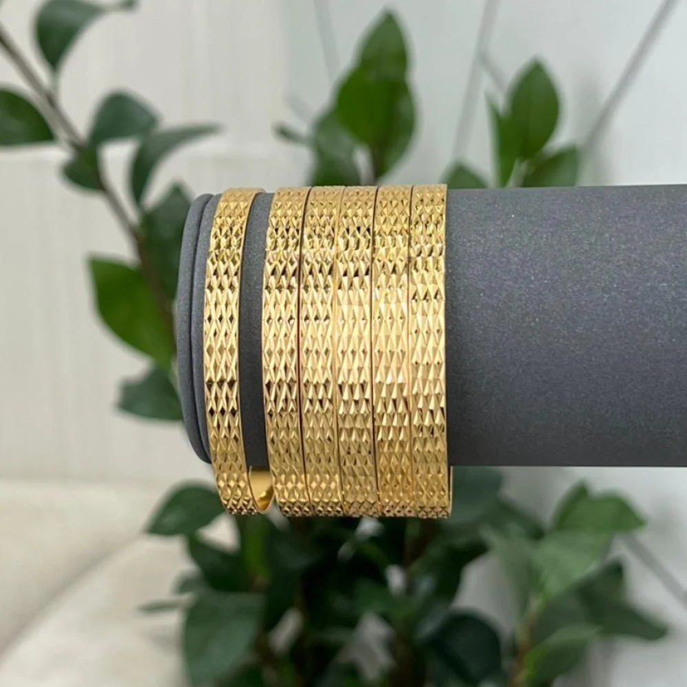 Gold-plated bangles are a touch of luxury that subtly illuminates your wrist. With their intricate engraving and lustrous gold plating, these bangles add a captivating golden sheen that enhances any look. They are a versatile accessory suitable for all times and occasions, whether formal or informal.