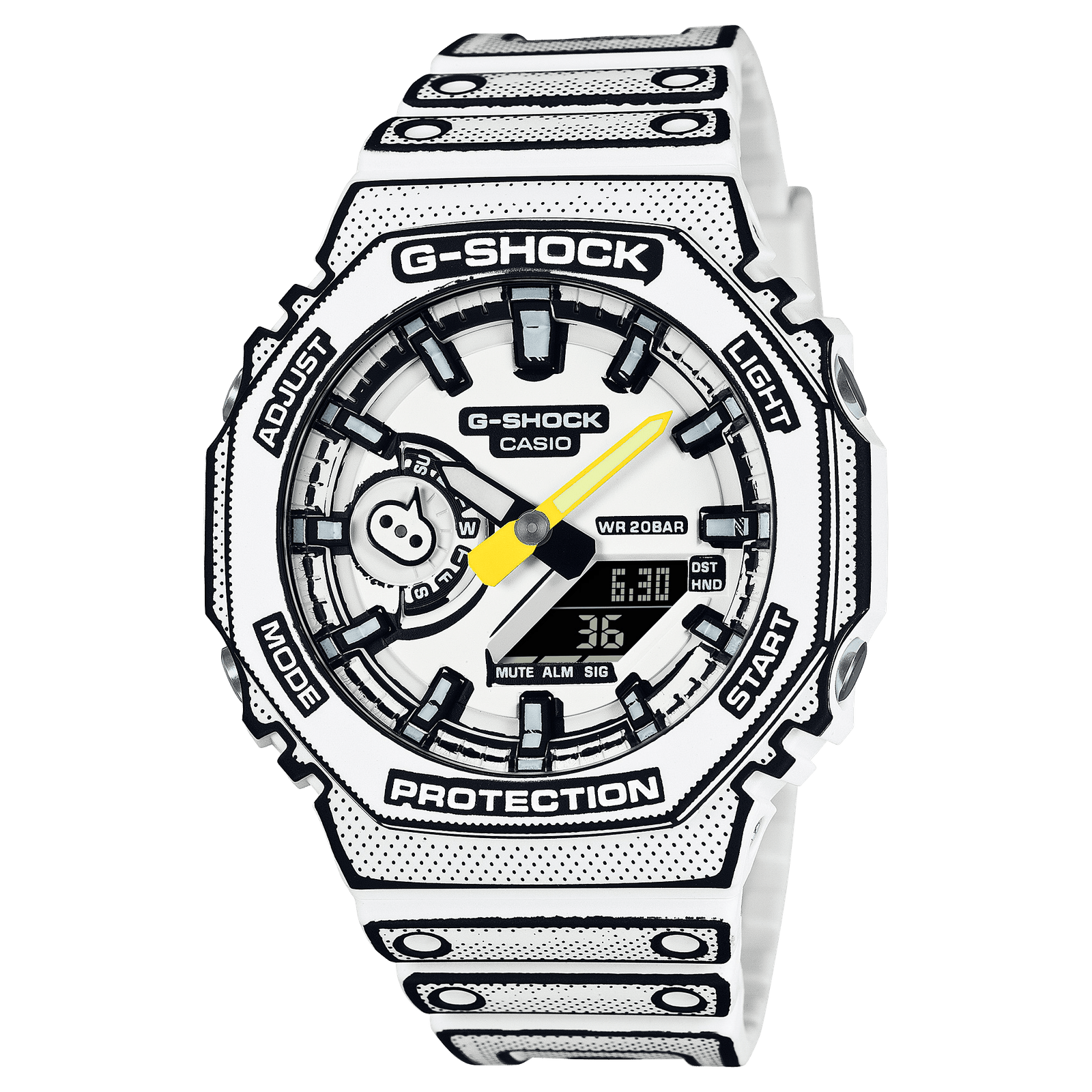 - Features: It is a standard G-Shock timepiece with shock resistance and 200-meter water resistance. The day of the week indicator on the dial at the 9 o’clock position is shaped like a speech bubble, adding to the playful, comic-book aesthetic.