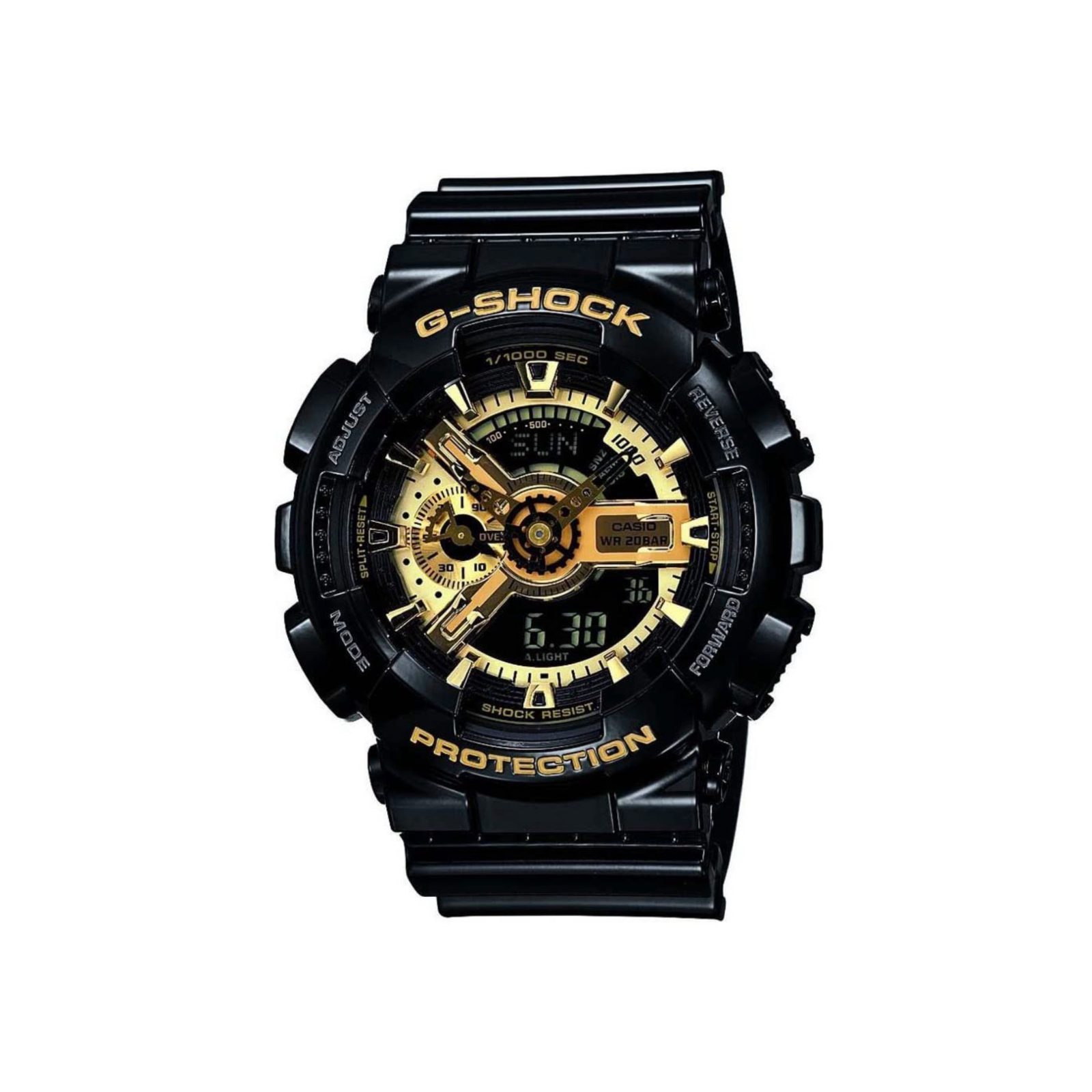 This black and gold analog-digital watch is a high-quality imitation inspired by the popular GA-110 series design. It features a bold and stylish look with a combination of resin strap, durable case, and gold-tone dial accents that give it a premium appearance.
