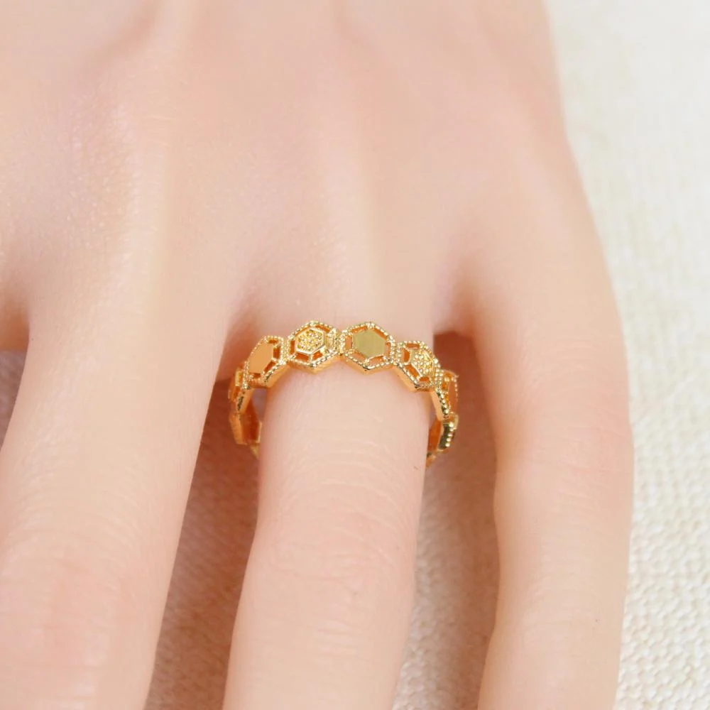 Choose the gold alternative ring with the hexagonal design now to give your hands a touch of luxury and elegance, available in multiple sizes to suit you.