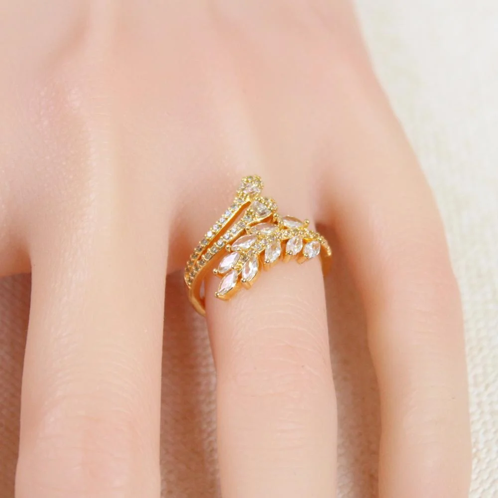 Features of a gold-plated alternative ring with zircon leaf embellishments: