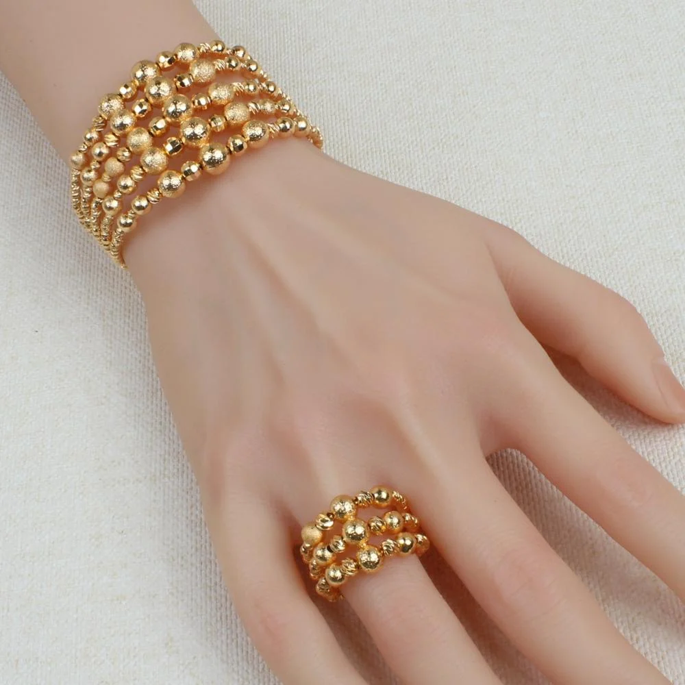 A luxurious and distinctive set made of gold alternative, combining a ring and bracelets designed in an elegant style with large and small balls in the middle that highlight the beauty and elegance of the design, to give you a sophisticated and modern look suitable for all occasions.