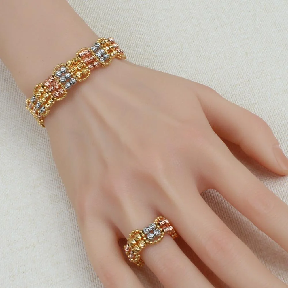 The gold-tone jewelry set, in vibrant colors, combines sophisticated taste with modern touches in a variety of gold hues that highlight your femininity uniquely and attractively. Its delicate mesh design adds a touch of vibrancy and elegance to your everyday look.