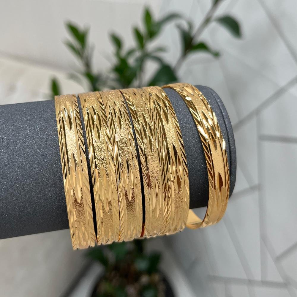 Gold-plated bangles are a touch of luxury that subtly illuminates your wrist. With their intricate engraving and lustrous gold plating, these bangles add a captivating golden sheen that enhances any look. They are a versatile accessory suitable for all times and occasions, whether formal or informal.
