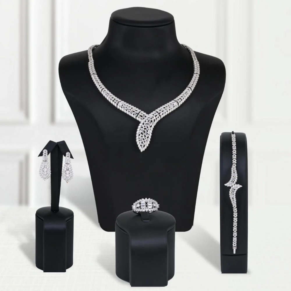 - The set includes: a necklace, earrings, a bracelet, and a ring.