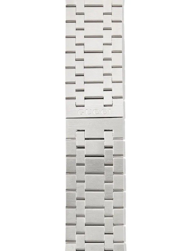 Iconic Pattern: The dial is embossed with horizontal lines and the signature interlocking G motif as a nod to classic design codes.