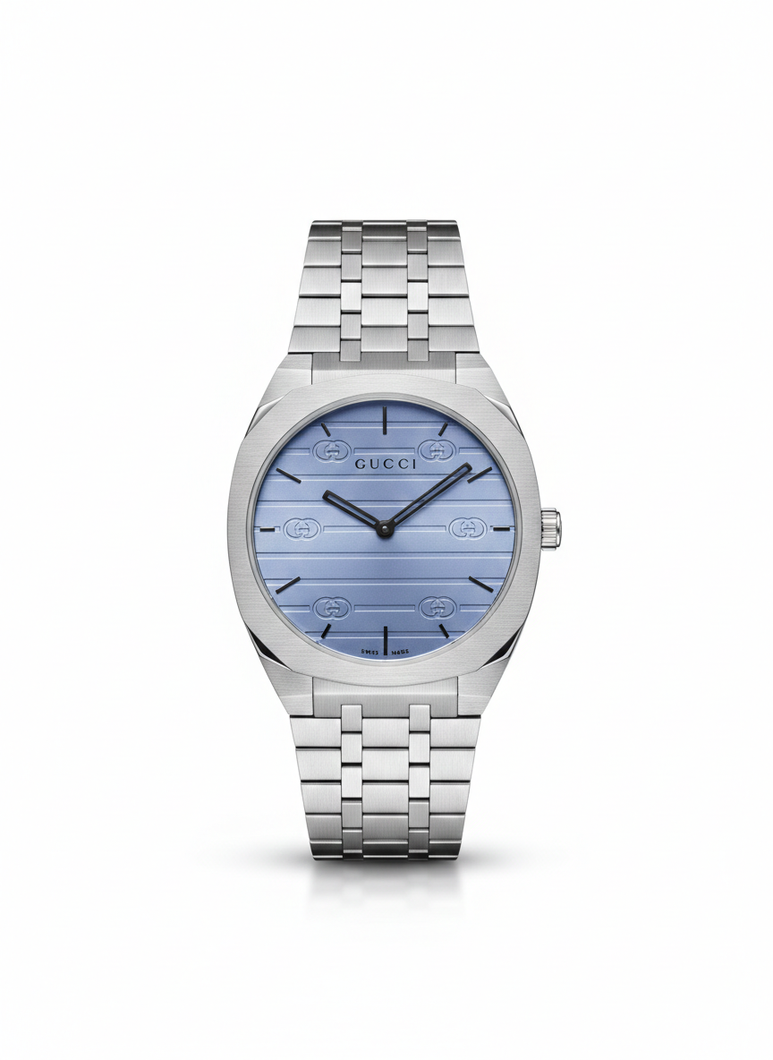 Inspired by the contemporary 25H collection, this watch brings a fresh, architectural look to your wrist. The stunning ice blue dial features a subtle textured pattern that catches the light beautifully, paired with a multi-layered case design for a truly professional finish.