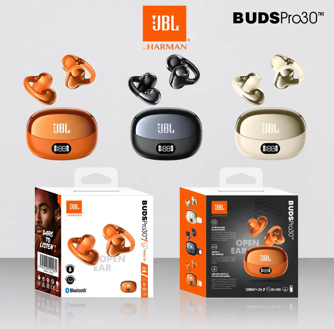 Upgrade your audio experience with the JBL Buds Pro 30 TWS. These high-quality open-ear wireless earbuds deliver clear sound, deep bass, and all-day comfort. Featuring a stylish LED display charging case and long battery life, they are perfect for daily use. Available in 3 premium colors – Black, Beige, and Orange.
