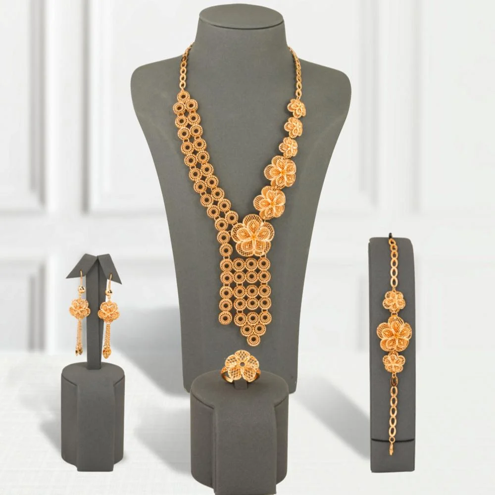 Discover the perfect blend of sophistication and charm with the Luxury Floral Gold Alternative Set. Designed to capture attention with its delicate floral motifs and luxurious finish, this set brings a touch of elegance to every outfit. Ideal for women who appreciate refined style, it’s a beautiful choice for both everyday wear and special occasions in the Saudi Arabia region.