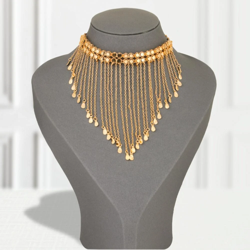 The luxurious waves of gold-plated jewelry is the perfect choice for those who wish to add a touch of glamour and sparkle to their look. Its unique design, combining shimmering circles and dangling chains, guarantees an elegant and luxurious appearance.