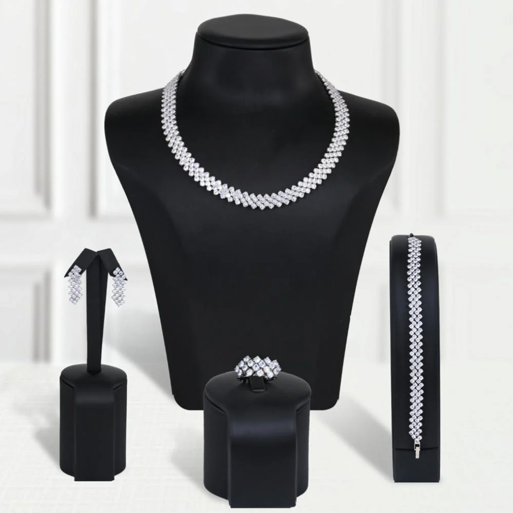 - The set includes: a necklace, a bracelet, earrings, and a ring.