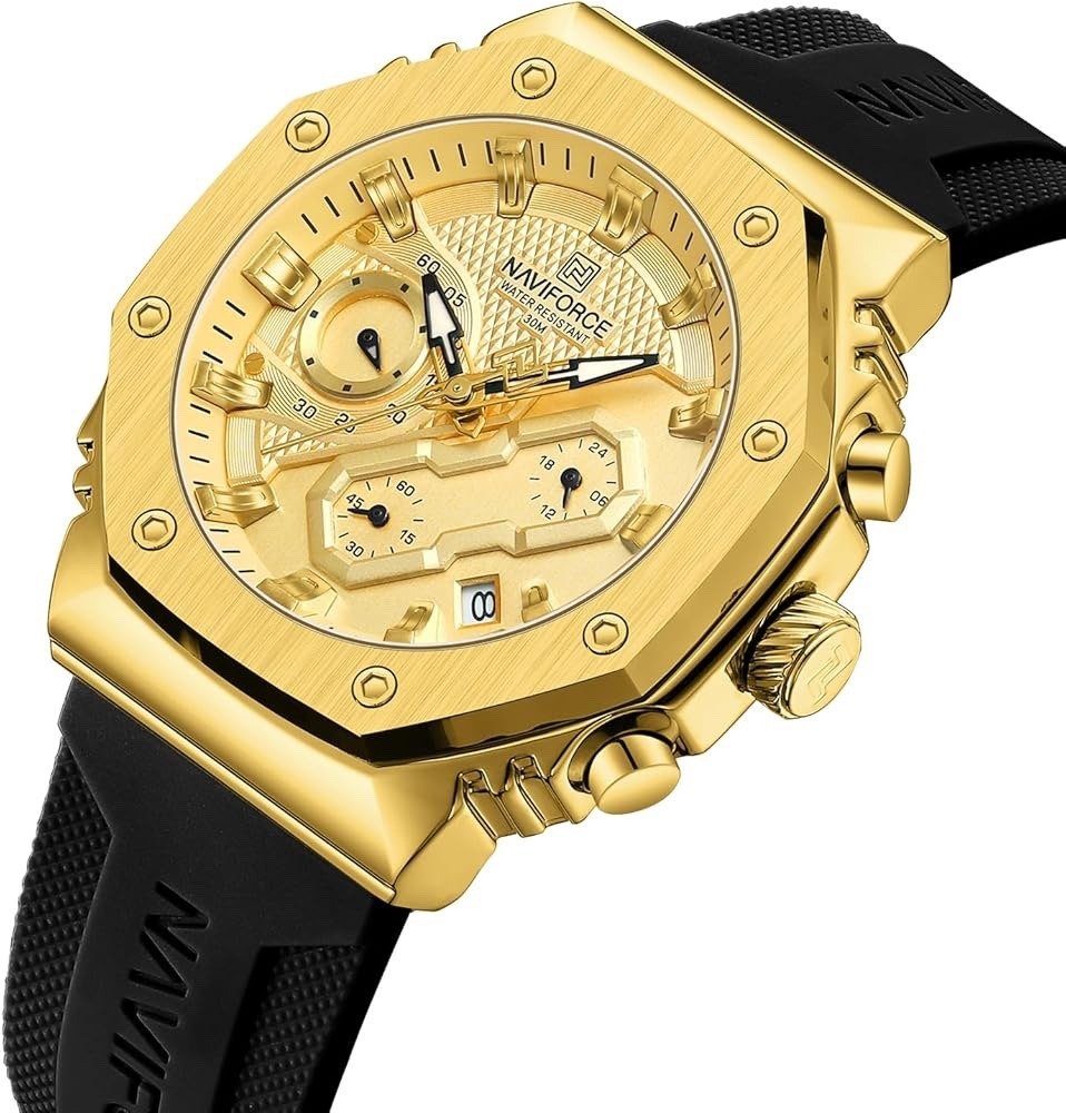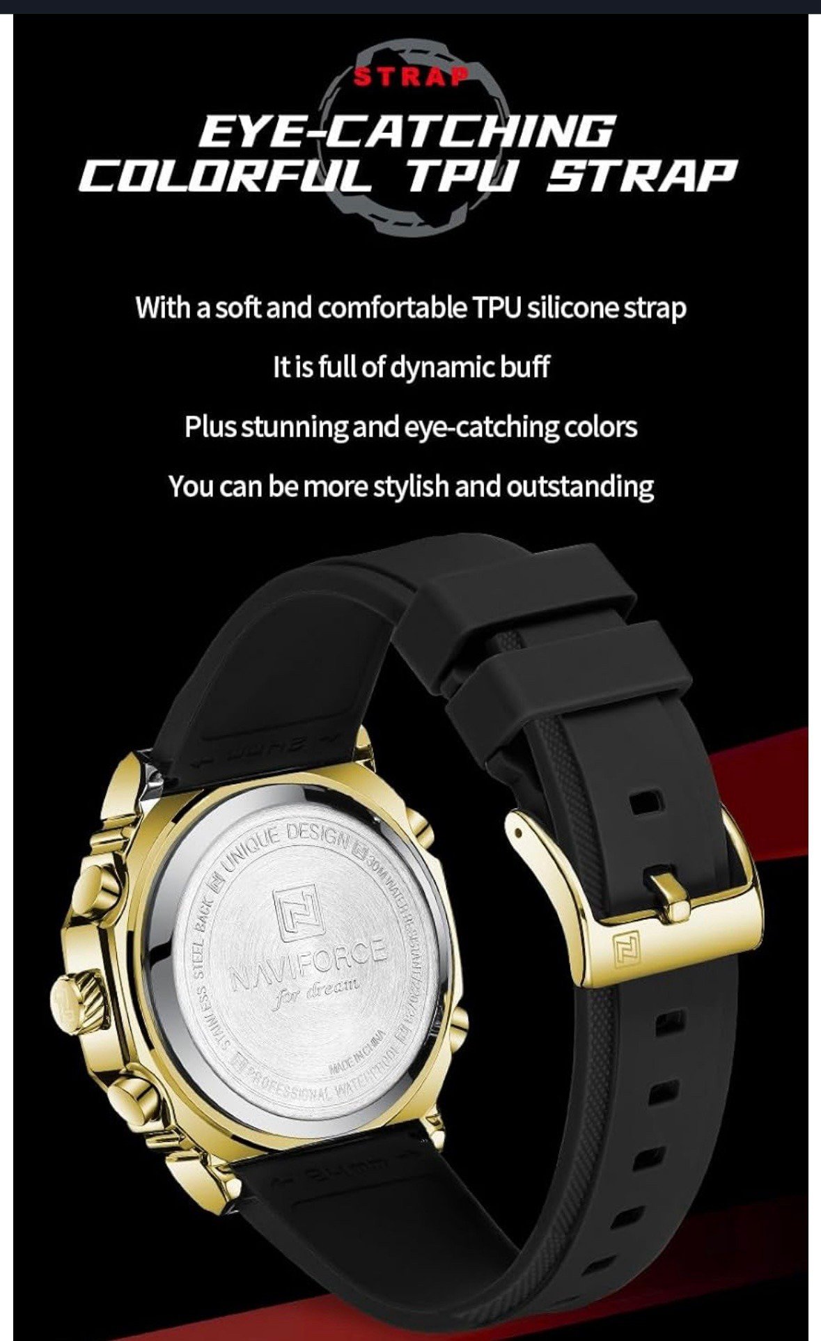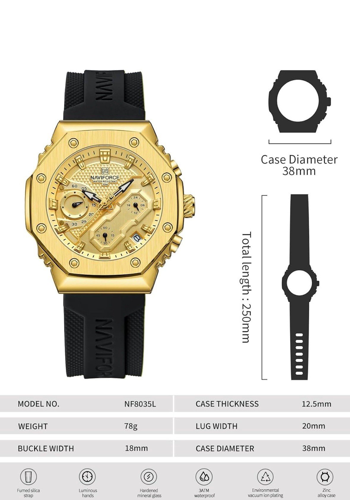 The Naviforce 8035G is a premium unisex chronograph sports watch designed for performance, comfort, and style. Built with a strong waterproof case and a soft silicone strap, it is suitable for everyday use as well as sports activities.