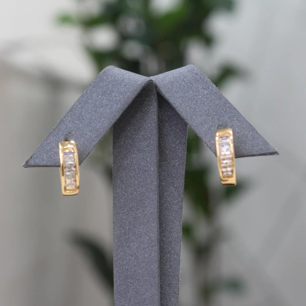 These rectangular zircon gold-plated earrings are the perfect choice for those seeking an elegant and dazzling look. Featuring a simple, modern design with a touch of luxury, they are adorned with rectangular zircon stones that add a distinctive and opulent sparkle. Made from high-quality materials and plated with gold, they ensure a long-lasting look.