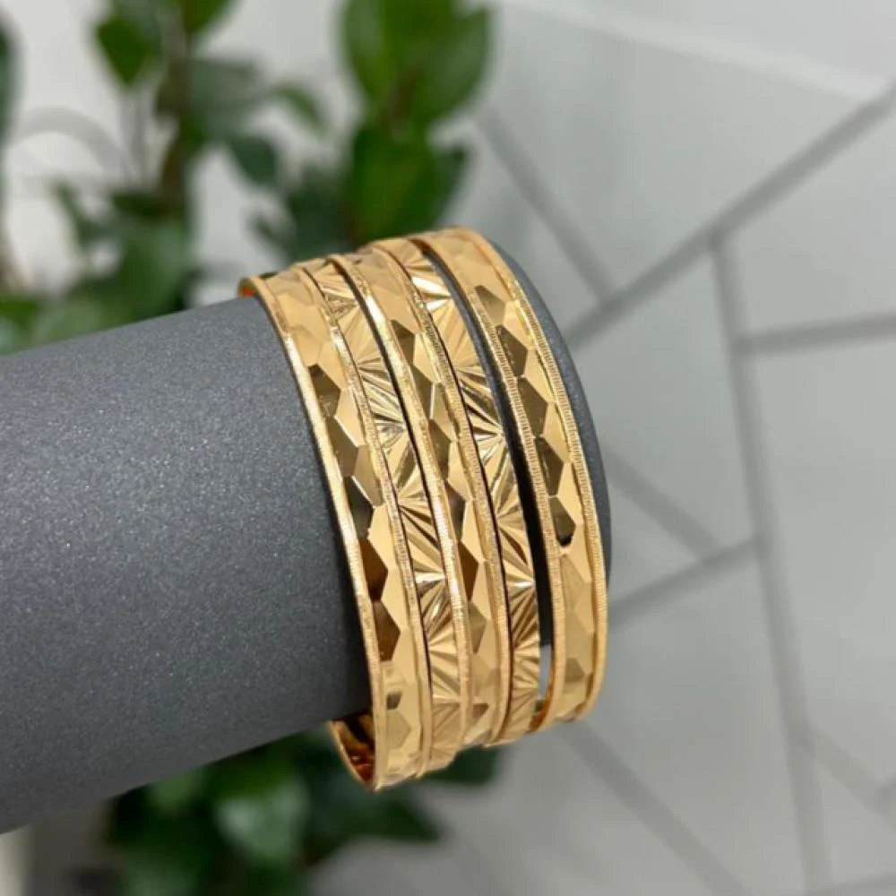 Gold-plated bangles are a touch of luxury that subtly illuminates your wrist. With their intricate engraving and lustrous gold plating, these bangles add a captivating golden sheen that enhances any look. They are a versatile accessory suitable for all times and occasions, whether formal or informal.