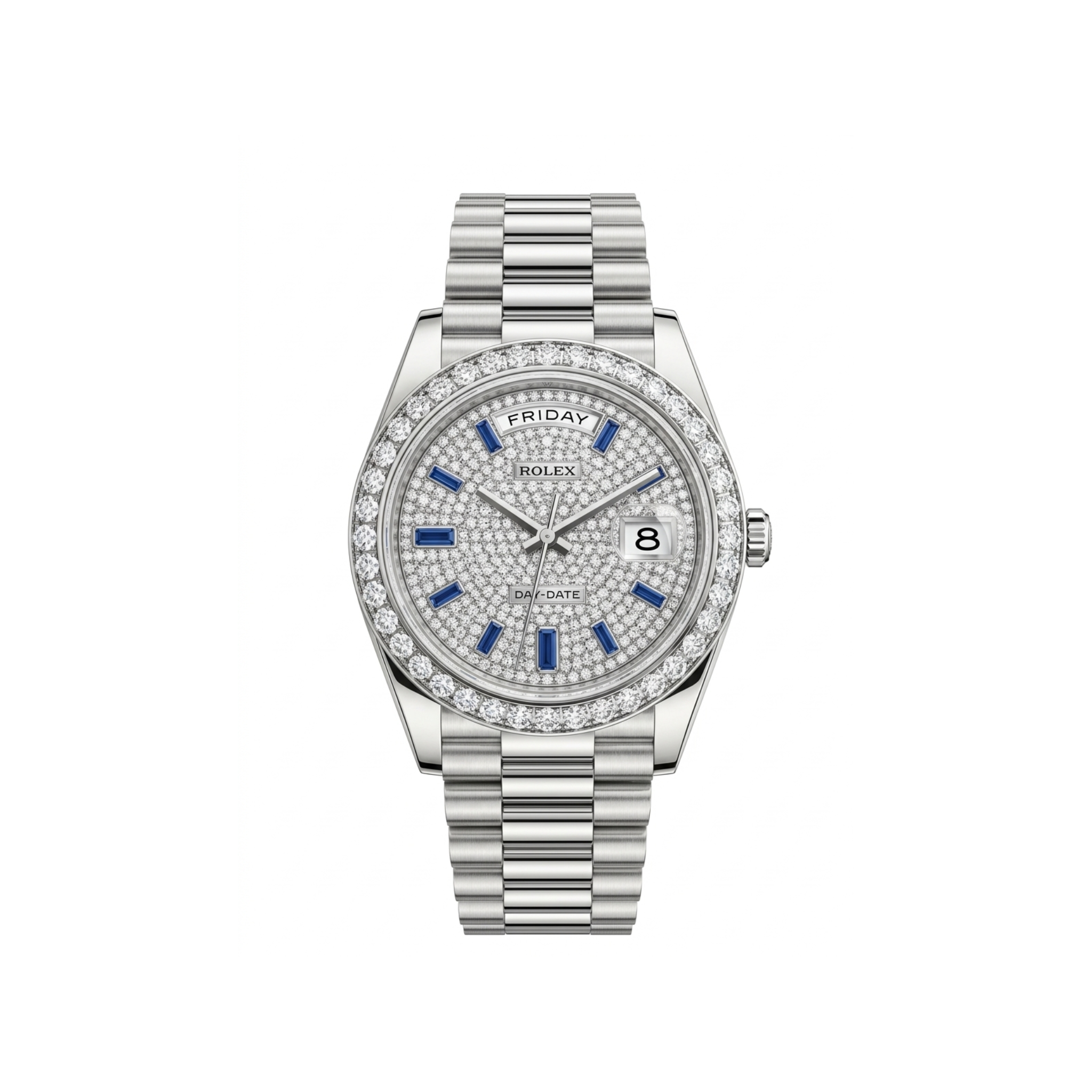 Dial: Full diamond-studded face with a “Friday” day window at 12 o’clock and a date magnifier at 3 o’clock.