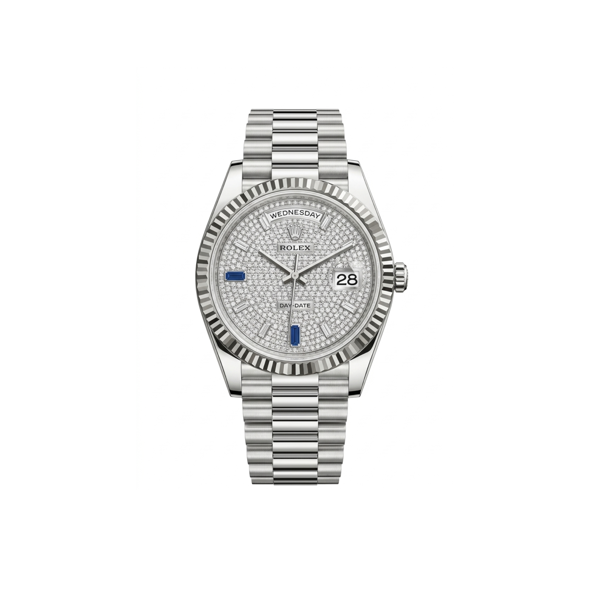 This silver-toned Rolex Day-Date combines classic luxury with a contemporary edge. The polished silver case and iconic bracelet are complemented by a high-shine bezel set with shimmering stones. The dial is a work of art, fully encrusted with crystals and accented by deep blue sapphire-style markers for a touch of royal contrast.