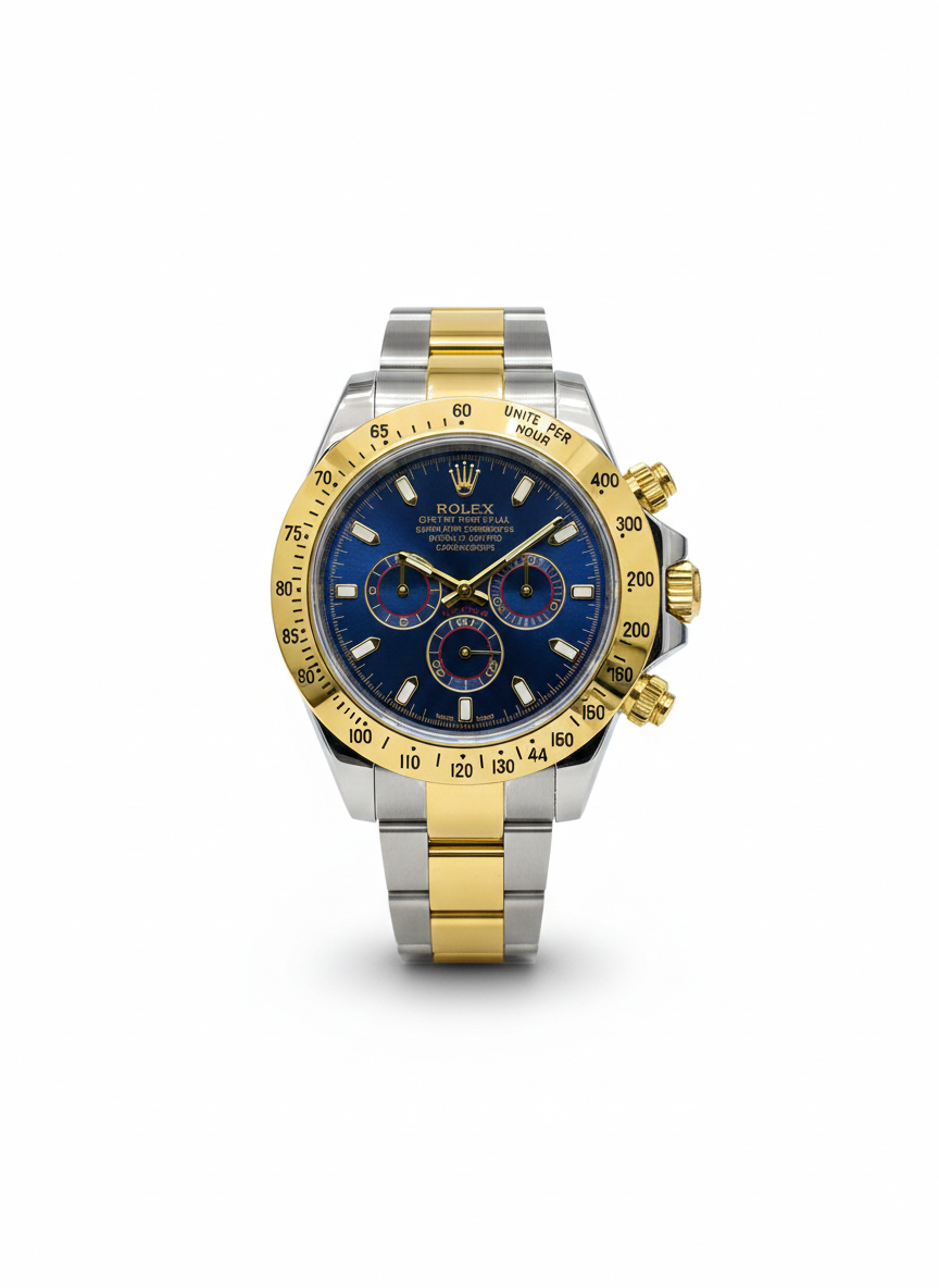This professional-grade timepiece is the perfect blend of iconic design and modern reliability. Inspired by the legendary Rolex Daytona, it features a high-quality two-tone stainless steel bracelet and a vibrant blue dial that catches the light from every angle.