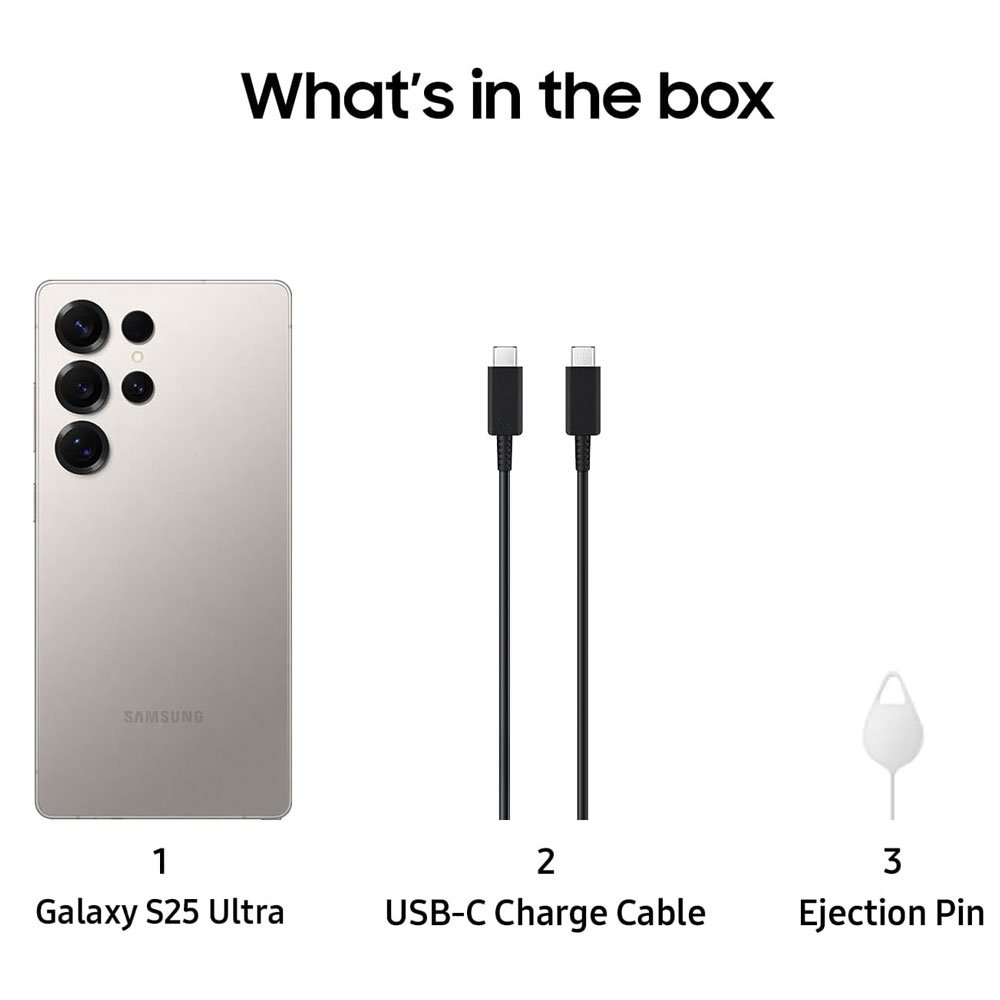 | What’s In The Box | Samsung Galaxy S25 Ultra, USB Type-C Cable, Sim Ejection Pin, User Manual |