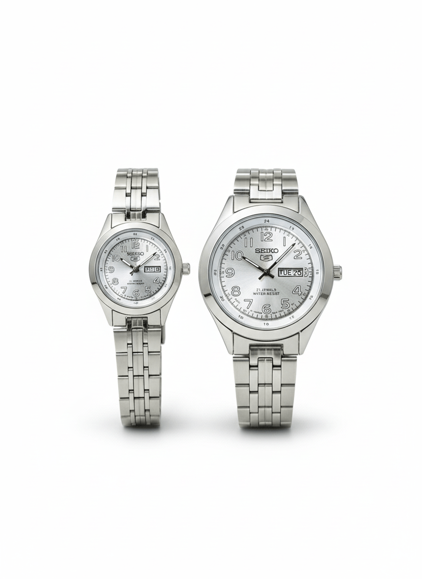 Celebrate timeless elegance with the Seiko 5 Inspired Executive Couple Set. These timepieces are meticulously crafted for those who admire classic luxury design combined with modern practicality. This premium inspired collection features a high-grade metallic build, offering the substantial weight and polished shine of a top-tier dress watch.