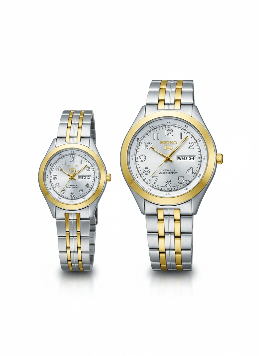 Celebrate timeless elegance with the Seiko 5 Inspired Executive Couple Set. These timepieces are meticulously crafted for those who admire classic luxury design combined with modern practicality. This premium inspired collection features a high-grade metallic build, offering the substantial weight and polished shine of a top-tier dress watch.