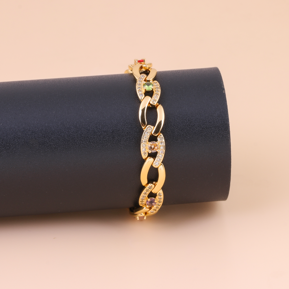 A gold bracelet with colored zircon, gold plated, suitable for wearing with watches and delicate bracelets, giving a harmonious and attractive look at work, university, or big occasions.