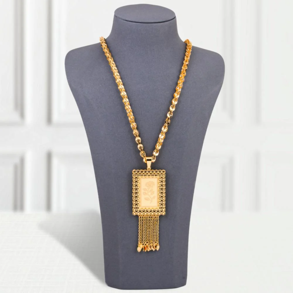 Choose this square gold-plated necklace for a look that combines luxury and refined taste. This necklace features a unique design consisting of an ornate gold square with delicate and luxurious details, adding a touch of beauty and sophistication to your look for any occasion. It is crafted from high-quality materials and plated with gold to ensure the piece remains shiny and attractive for a long time.