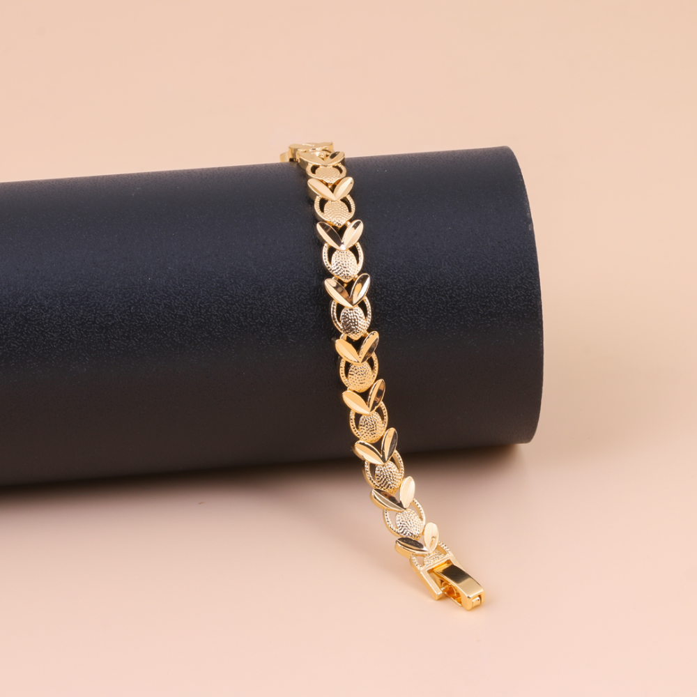- A delicate gold bracelet featuring an elegant and attractive design, resembling the distinctive and lightweight look of real gold.