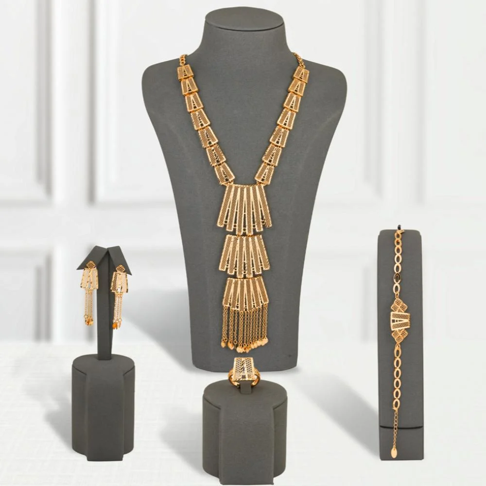 - The set includes: a necklace, earrings, a bracelet, and a ring.