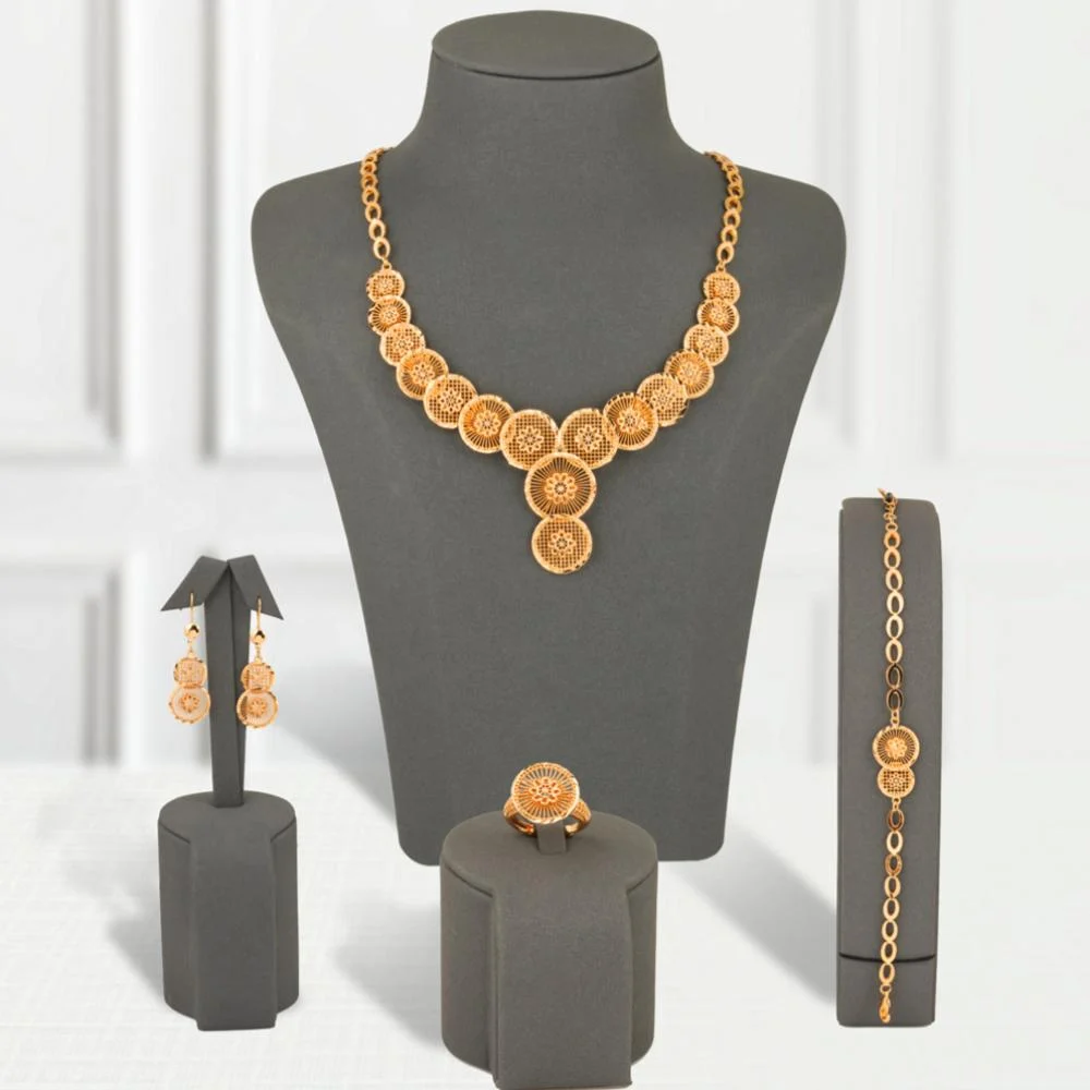 Shine with exceptional allure in this gold-plated sunflower set, inspired by the beauty and elegance of radiant flowers. Its exquisite circular design exudes luxury with a modern touch, adding a touch of glamour to your look.